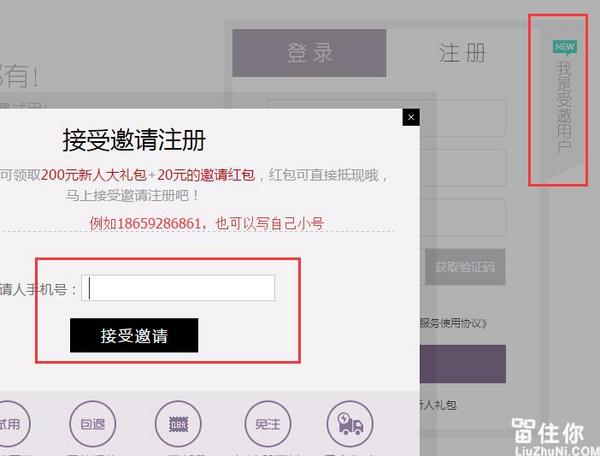 例如填写留住你:18659286861(也可填写你自己大号),注册成功后,你的账户里面会有2个10元的现金券;