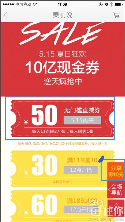先撸券!美丽说 515夏日大促 10亿现金券, 例如10,50元现金券