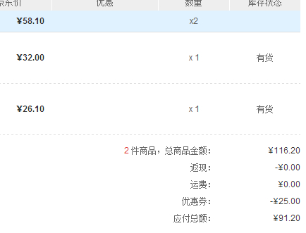 京东商城目前62元在售,实际加入购物车为58.1元,这样的话本身就是低价了,还可使用满99减25优惠券,那么我们就买两套,支付91.2元,折45.6元/套,每瓶23元左右,好价格了。
