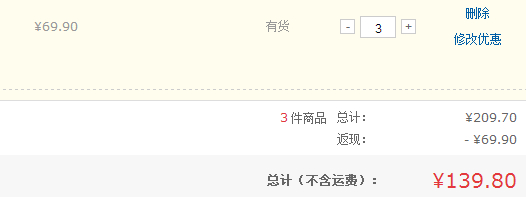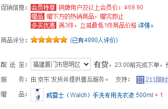 京东商城目前73.9元在售,≥铜牌可享受69.9元,然后还送500g的手洗洗衣液,再叠加满3免1活动,留住你的会员可以直接加入3件到购物车,会减免69.9元,我们实付139.8元到手3瓶3L的+3瓶500g的,显然是好价格啦。