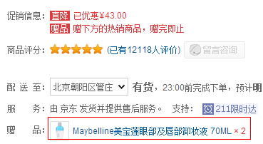 白菜价:Maybelline 美宝莲 眼部及唇部卸妆液 7.6元(23,买1送两)