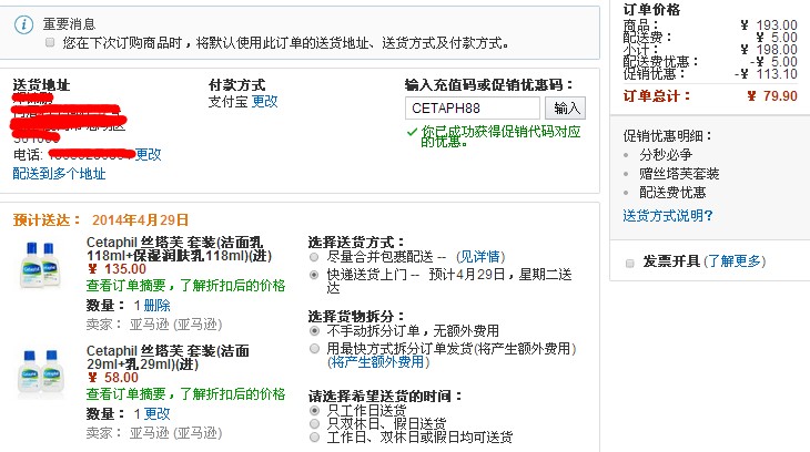 丝塔芙这款组合平时售价135元,亚马逊Z秒杀目前降到79元在售,另外赠送价值58元的旅行套装一起加入购物车,结算时输入优惠“CETAPH88”即可,相当于193-113.1=79.9元,其他商城普遍100元以上还没有赠品。