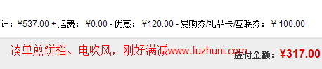凑单方面小编也给个方案129的美的MC-JHN30F 煎烤机/电饼铛、还有39的飞科(FLYCO)电吹风,也就是369+129+39-100-120,实付317元包邮到手全部。