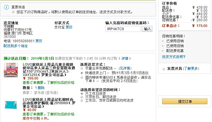 亚马逊平时售价399元,目前Z秒杀价259元在售(秒杀页面按分类“家居”找到商品),liuzhuni再将40元的运动按摩护腕枕一起加入购物车,结算时再输入优惠码“IRPAKTC9”再减120元,最后179元包邮到手两样,价格非常难得,相信很快会抢完。