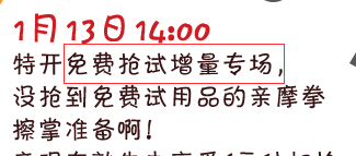 早上6元的专场不少朋友都参加拉,然后呢目前页面还提示14点会开启免费抢试增量专场,昨晚凌晨错过的朋友可以继续了,具体产品的话目前页面还看不到,应该稍后就会更新了;在此感谢多位留住你热心朋友提醒;
