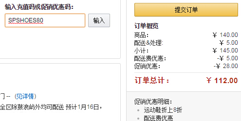 亚马逊目前降价到140元,,本身就是低价了,还可参加下单8折活动,结算的时候输入优惠码:“SPSHOES80”即可,实付112元包邮到手;