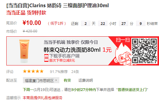 娇韵诗(CLARINS)是法国的世界著名品牌,成立距今已有60年的历史;当当网目前降价到10元,神价格了,日常要200多,估计临期,但是也劲爆,可惜只有福建有货。