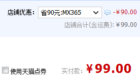 天猫商城专卖店标价189元,加入购物车后立减90元,实付99元包邮,红白蓝三色可选,这次单买也是最低了,其它商城130元以上。