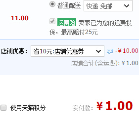 天猫旗舰店目前11元包邮到手,liuzhuni.com的朋友们在这个页面可以领取10元券(需100积分),实付1元包邮到手,不过这个券之前就推荐过了,有领取过的朋友不能重复领取,价格白菜,非喜勿入;感谢留住你热心朋友分享;