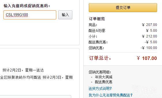 亚马逊目前69元在售,本身就是低价了,留住你亲测支持参加199-100元的活动,凑单满减后差不多是半价即可参加活动;结算的时候输入优惠码:“CSL199G100”;
