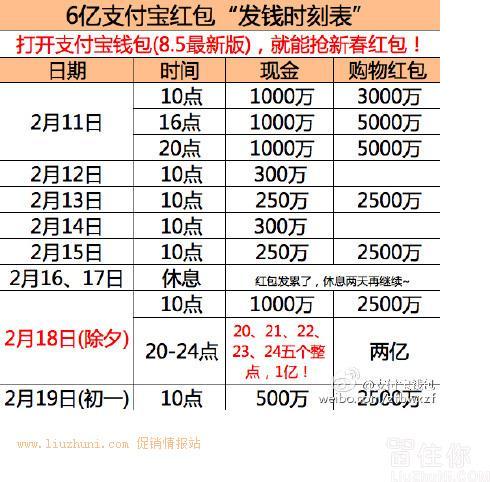 活动预告: 2月11日起~2月19日 6亿支付宝红包来啦 附红包发放时间表