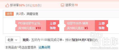 一号店目前开启了一波母婴用品、辅食促销,力度为满199立减100,力度还是不错的;部分产品页面下方还可领取10元券。
