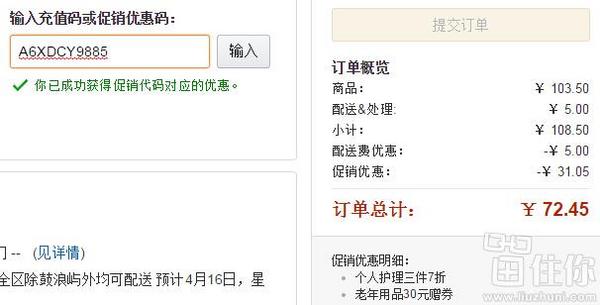 亚马逊34.5元(不要选择订购省),本身已是好价,还可参加个护健康3件7折的活动,直接加入3件到购物车,结算的时候输入优惠码:A6XDCY9885,折24.15元/件,12.1元/瓶,同款其他渠道单瓶售价30以上。