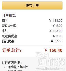 亚马逊188元在售,参加运动鞋精选折上8折促销活动,结算时输入优惠码:“SPSHOES80”,实付150.4元包邮,近期好价,40到44码可选。