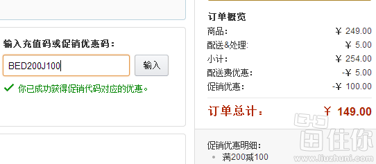 亚马逊249元在售,可参加家纺满200减100的活动,在结算时输入优惠码“ BED200J100 ”,实付149元到手,夏天到了,凉席走起!