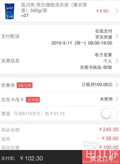 例如这个蓝月亮洗衣液500g的,满27袋,可以减免38元,结算再使用200-100券,实付102.3元到手,价格不错,适合拼单;