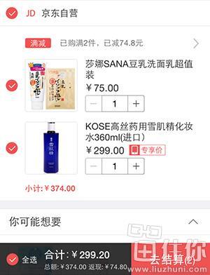 京东商城手机端299元在售,凑单一件75元的莎娜SANA豆乳洗面乳超值装,可2件打8折后299.2元,再叠加刚才领到的美妆299减120元优惠券,实付179.2元包邮,历史低价。