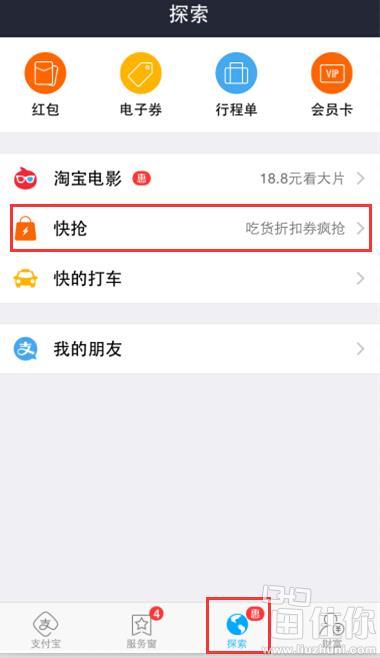 2、之后,打开手机上的支付宝钱包,到“探索”页面,找到“快抢”,在里面领取顺丰海淘20元红包。
