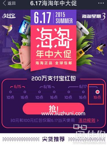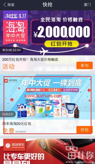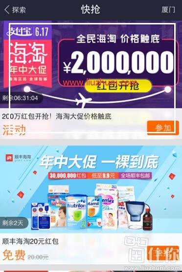 4、之后就是等19点了,支付宝钱包“探索”页面,找“到快抢”,然后打开第1个红包,等着晚上19点的时候领取100-30的支付宝海淘红包,(如果运气好,就是101-100的);注意这个红包是不限制顺丰海淘的。