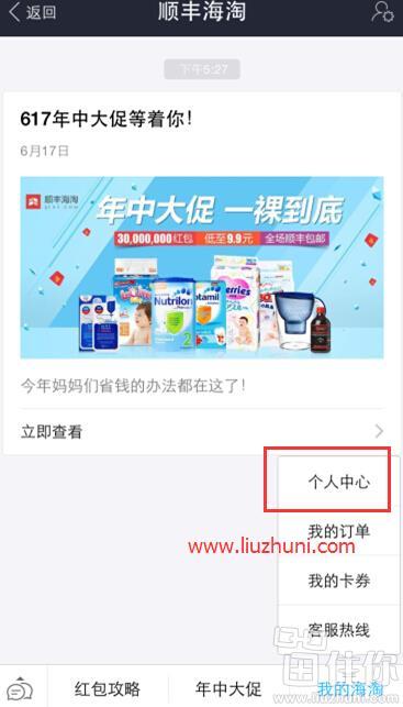 3、然后点击“红包”查看红包,点击立即使用,然后关注顺丰海淘服务窗,我的海淘里面用顺丰海淘账号登陆,检查是否有100-30优惠券。