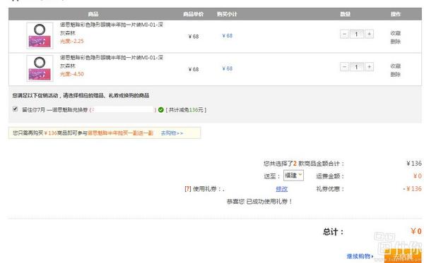 那么让我们来揭晓这100位朋友是谁吧?美瞳神券和积分稍后小编将通过站内小短信发给大家,收到后,前往美瞳的商品页面(券尽快使用,月底到期),138-138,购物车页面输入礼品券号,就是0元了,而且无需运费哈,大雄的福利靠谱滴,最后再次感谢大家的支持;