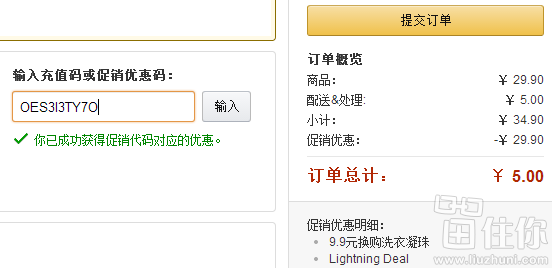 亚马逊Z秒杀售价9.9元,大家和杜蕾斯小雨衣一起凑单,在洗衣凝珠的下方领取9.9元换购的优惠码,又或者在订单结算时输入优惠码OES3I3TY7O,最终只需5元包邮即可到家;