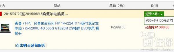 返券低价~~惠普14英寸笔记本电脑产品,配置方面采用酷睿I5-5200U双核处理器,主频2.2GHz,内存容量4GB,硬盘500GB。显卡是NVIDIA GF820M,显存容量2GB,带有DVD刻录机。接口有VGA、HDMI、USB等,默认win8系统,一年质保。