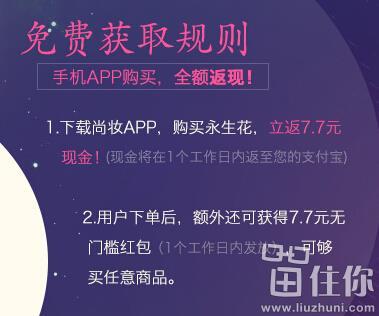 留住你首发为大家带来尚妆网的七夕活动拉,尚妆网目前七夕活动有个免费获取永生花活动,用户下载尚妆APP,然后在APP里面进行下单7.7元的永生花,1个工作日即可收到返现7.7元,会返现到您的支付宝;
