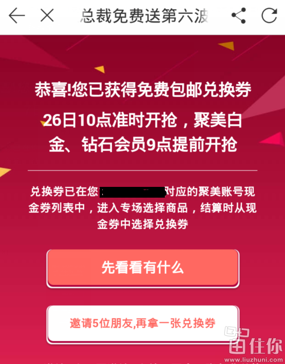 2、报名后到聚美手机APP首屏,下拉看到如下图所示,领取现金券;