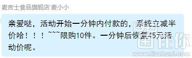 天猫旗舰店10点开启45元,前1分钟付款的,系统立减半价,也就是22.5元了,限购1件,1分钟后价格恢复常规的45元;手快点没压力;