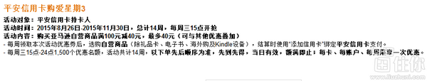 15点:亚马逊 平安信用卡专享 满100-40券 1500个名额等你来抢!