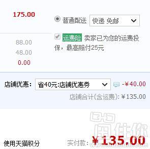 目前有天猫商家报价175元,领取40元优惠券,下单实付135元包邮,近期新低价,京东还在199元。