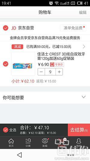 京东商城手机客户端6.9元特价,华北、东北和西北地区有货,还能满59减15/满99减30等,比如下单9件减15元,折合5.3元一件,新低价。