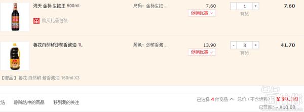 另外还可以凑单海天金标生抽王 500ml,参加满49减10元活动,实付39.3元,刚需可入;