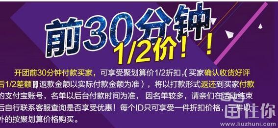 聚划算10点开启25.8元,前30分钟付款,可以享受1/2的聚价,收货后将付50%到支付宝账户,每个ID仅限1次,可以联系客服进行查询是否享受优惠;