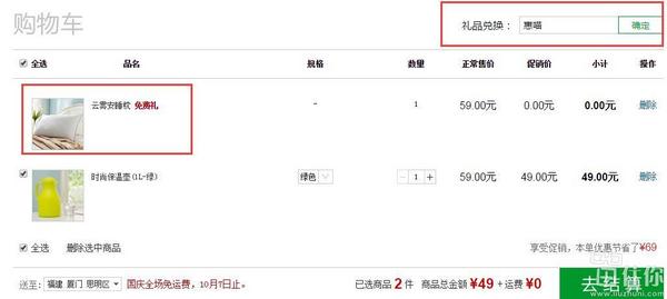 LifeVC丽芙家居促销价格49元,在购物车页输入优惠码:“惠喵”,还可领取价值59元的枕头一枚,最终实付49元包邮到手两件,非常的划算!