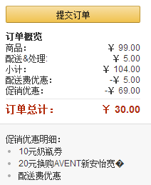 亚马逊目前售价69元,将30元的AVENT 标准口径玻璃奶瓶(8安士)240ml一起加入购物车,在此领取一张10元奶瓶叠加券(需加入亚马逊的家庭会员,输入宝宝名字和出生日期即可),下单实付30元包邮,价格非常给力了;