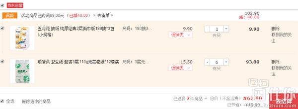 京东报价15.5元,本身好价,还可以参加满99-40活动,一次性买6提,再凑单9.9元的五月花 纯厚经典 2层面巾纸180抽*3包,实际支付62.9元,算下来每提还不用10元;