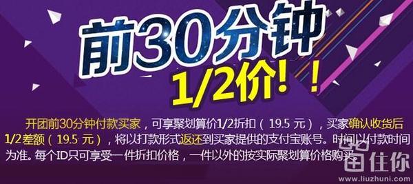 今天聚划算开启了好多的前30分钟1/2聚价,也就是在开团的前30分钟下单付款,可以享受返现50%的优惠,相当于半价了,不少东西价格都不错,小编也为大家小汇总下;时间为10点00~10点30。