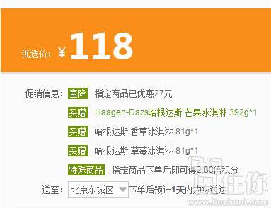 限地区# Haagen-Dazs哈根达斯 芒果冰淇淋 392g +赠品 折59元(118,买1赠1)