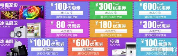 其他大家电的券就非常的多了,有电视方面的1000-100、3000-300、6000-600,还有厨卫的1000-80、2000-180、3000-300,8000-1000,5000-600等,其他不多说拉,大家领券先,其他单品保持关注留住你惠喵推荐;