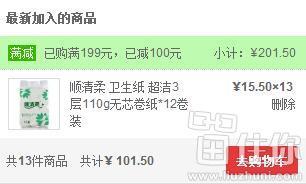 顺清柔超洁3层无芯卷纸 110gx12卷,采用原生木浆无香味。京东商城15.5元在售,买13提共201.5元,参加满199减100活动,下单实付101.5元包邮,需要的可以考虑。