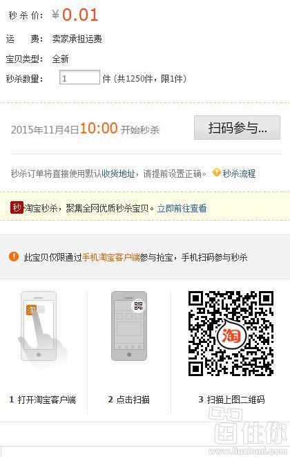 天猫旗舰店10点开启1分钱秒杀,数量为1250件,另外该产品需要在手机端进行下单,PC过去页面后扫描二维码即可,昨天没抢到的盆友可以继续!
