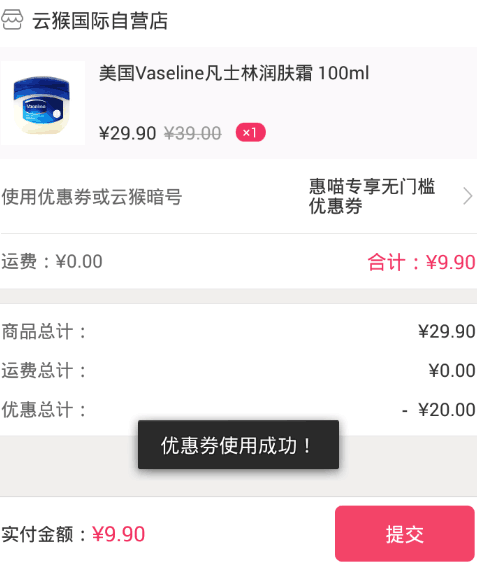 云猴网全球购目前售价29.9元,在惠喵APP领取20元现金券后,去云猴全球购APP下单,实付9.9元包邮到手,代购的价格在35左右,喜欢的盆友不要错过;