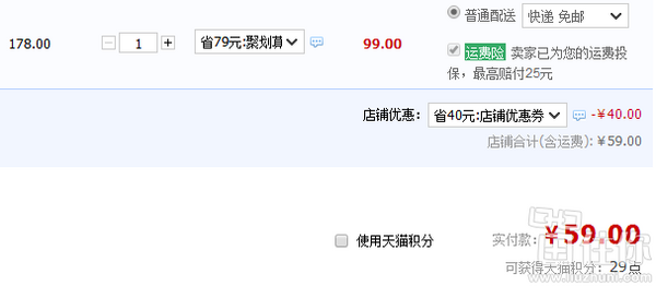 天猫旗舰店售价99元,可以领取店铺40元优惠券,实付59元包邮到手,而且买还送洁面乳60g+活力水15ml+润肤乳10ml+沐浴露100ml;
