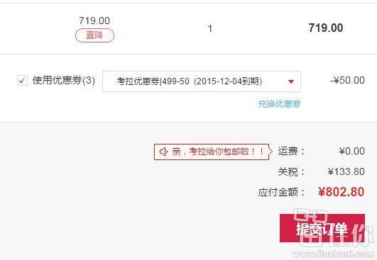 考拉海购目前719元在售,本身来到历史低价,还可使用留住你专属提供的满499-50的考拉优惠券,加上关税134元,实付803元即可包邮到手,这个价格对比海淘还划算,海淘一般是在900多左右活动价到手,又比首页推荐再将100元;