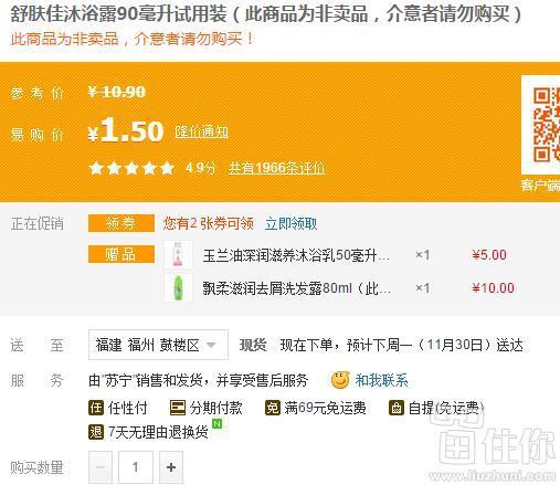 舒肤佳沐浴露90毫升试用装苏宁1.5元,价格一般,但有赠品玉兰油深润滋养沐浴乳50毫升+飘柔滋润去屑洗发露80ml,还是比较给力,华南华东等部分地区有。