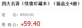 这款四大名著套装苏宁易购定价999元,目前降价至59.4元,折合每本仅15元,还是绣像珍藏本的,非常不错的一个价格;定价999元!似乎送人备有面子;更多苏宁1折图书链接在此。