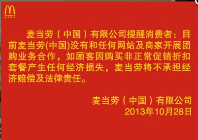 上期消费提醒:相信一些朋友已经知道消息了,早上点评团风风火火的麦当劳套餐销售了20多万份,目前麦大爷官网这边做出了回应表示从来未与任何团购网合作,这样的话就有点乌龙了,但是购买的朋友不要惊慌,此事一定会有一个说法的,之前DQ和美团网也有过类似的事件,最后是双方进行了赔偿。